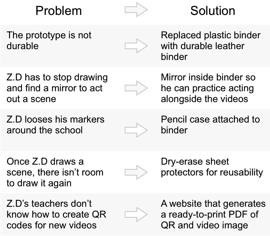 Z.D’s favorite activity was to draw his favorite characters in YouTube videos, but often struggled with that annoying ‘tip of the tongue’ phenomenon we all experience. He would have a video in mind, but couldn’t find the words to look it up. This pain point caused friction in an activity that was supposed to be a relaxing outlet, so my team designed a sketchbook with QR codes that link to Z.D’s favorite YouTube clips to make them more findable.