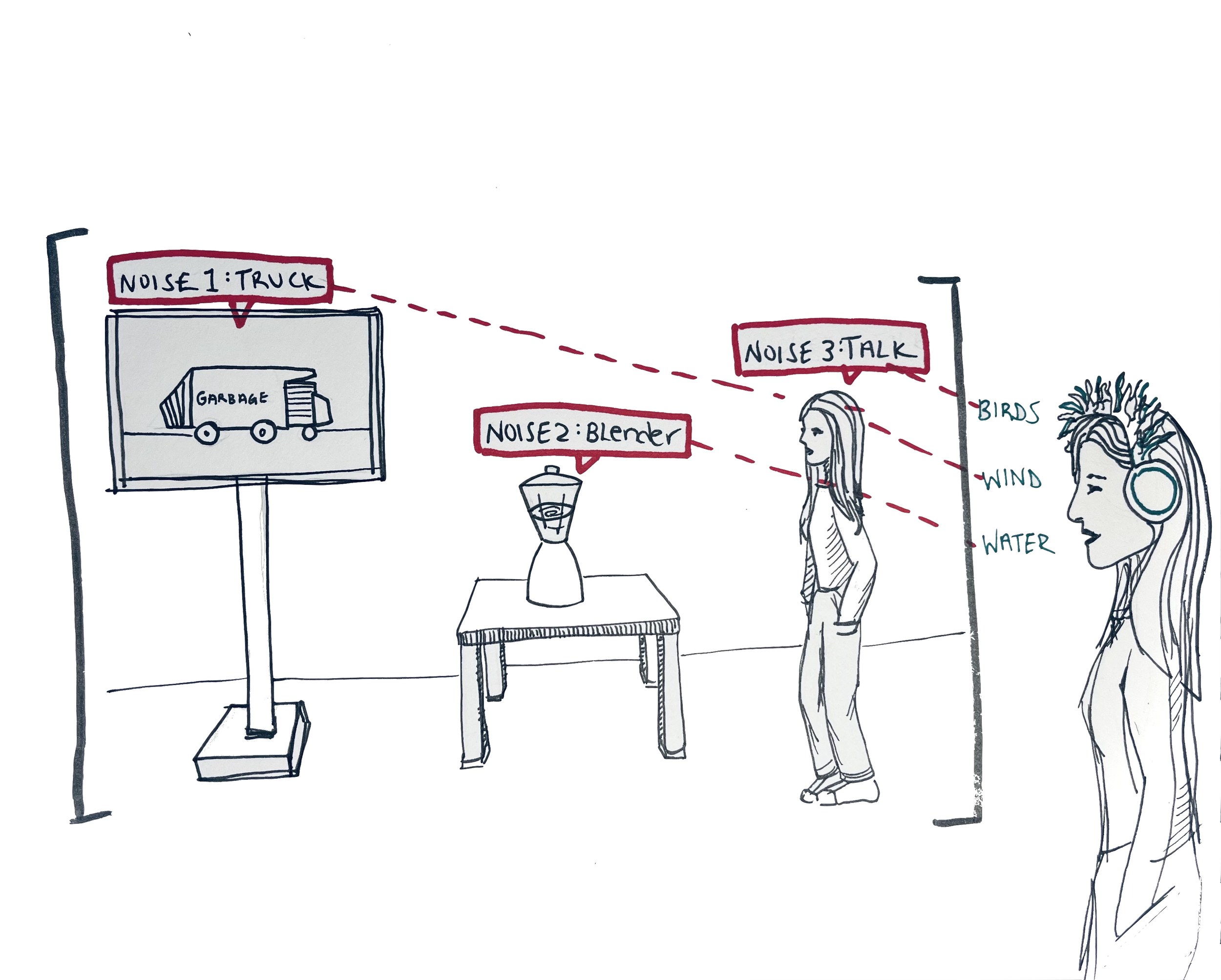 5 participants shared insights on the nuances of living in noise-polluted environments. These insights, as well as inspiration from existing solutions (loop earplugs, UW Semantic Hearing, Beoplay H95) inspired the creation of several conceptual prototypes.