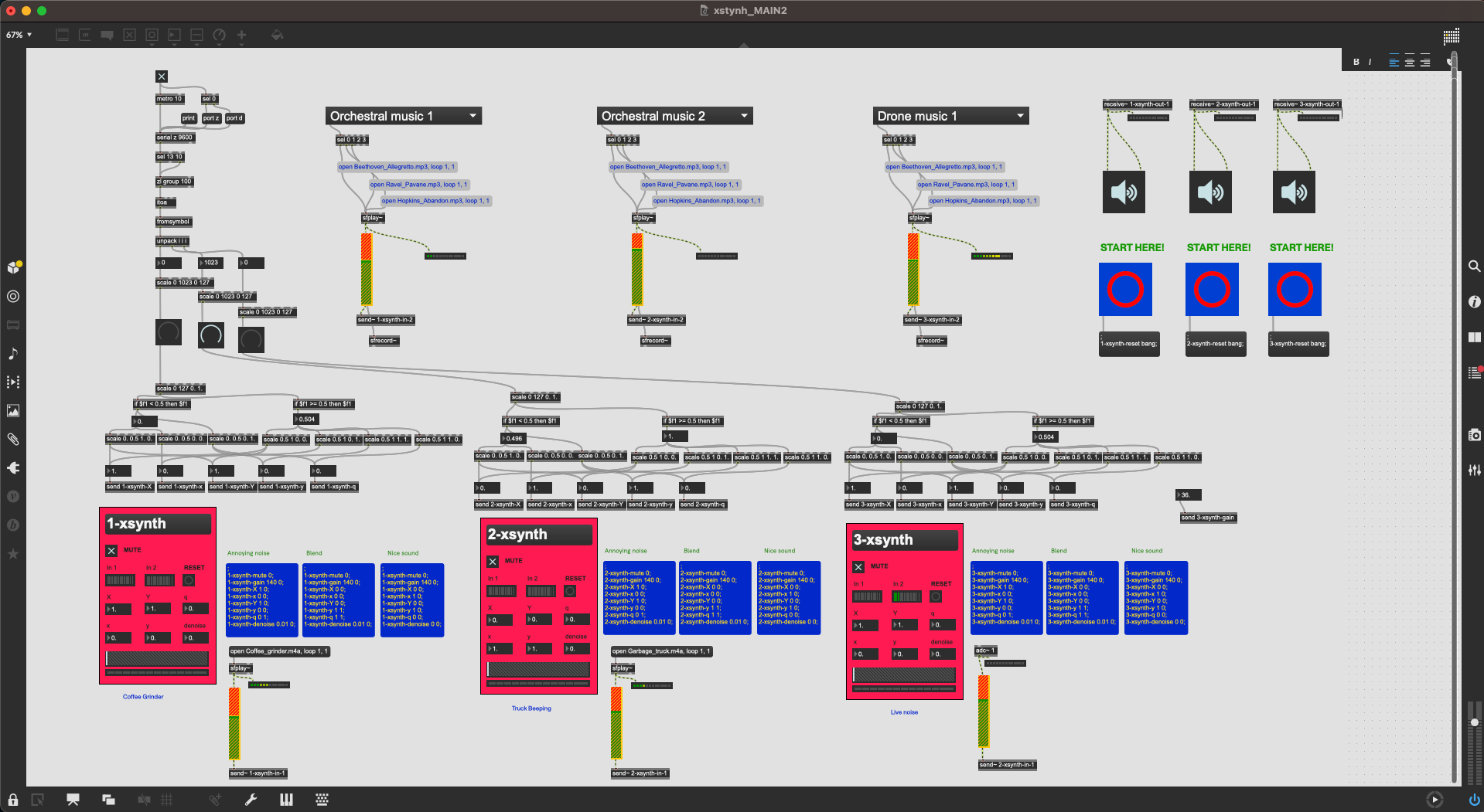 To prototype the experience, I used Max MSP to create three soundscapes: