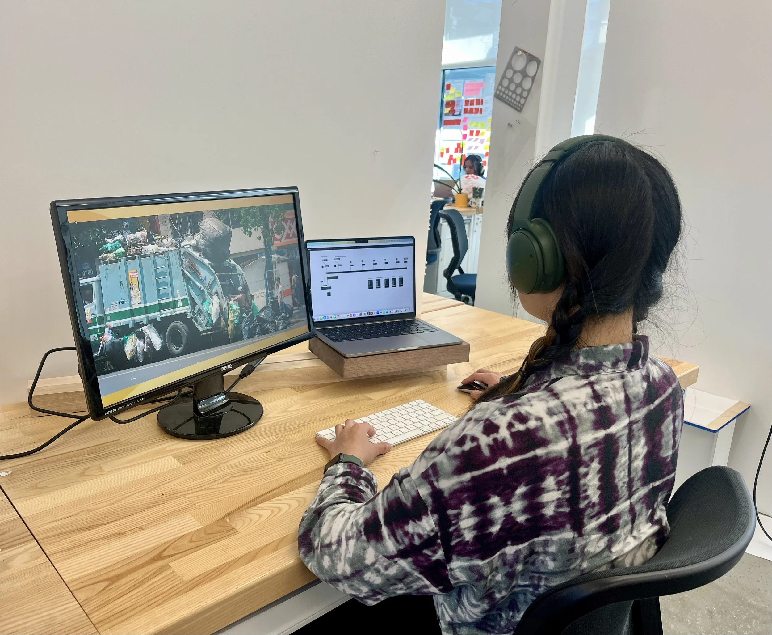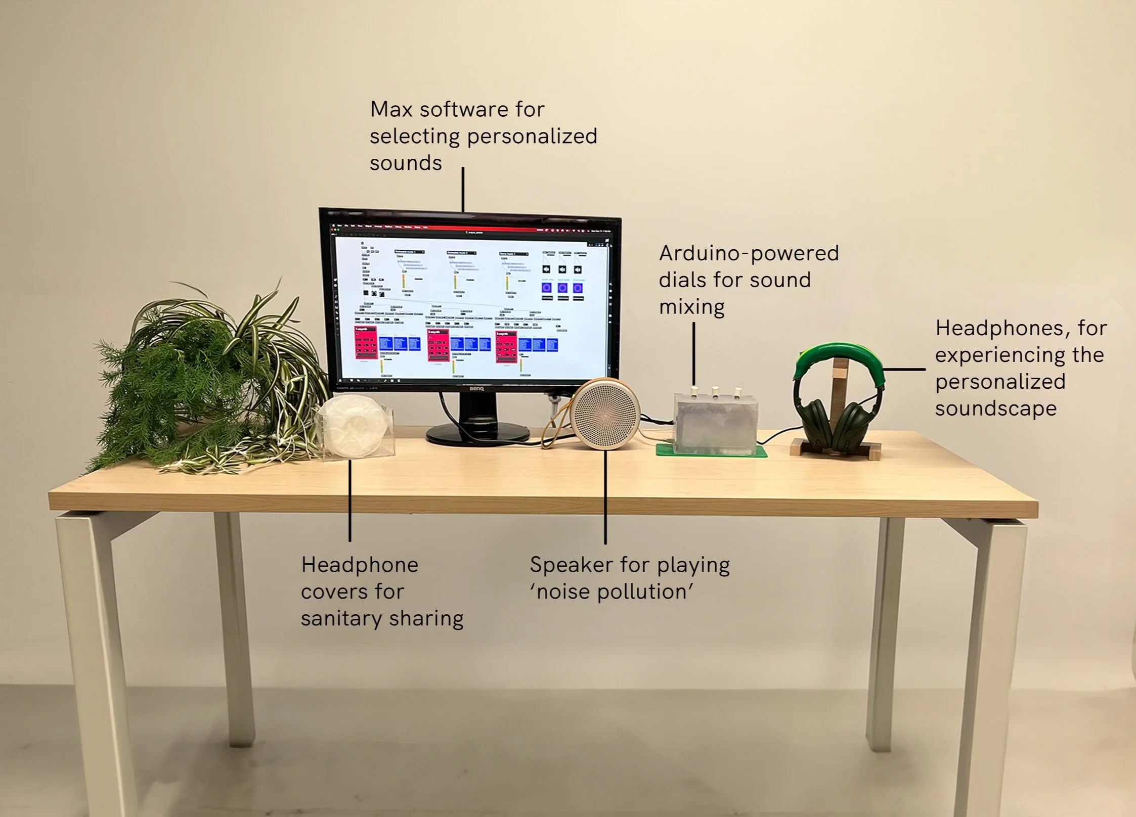 Noise-canceling headphones* mute all environmental noise. Max software detects environmental noises via the laptop microphone and passes the users’ preferred sounds through the headphones (i.e. nature or synth tones from a pre-loaded library).
