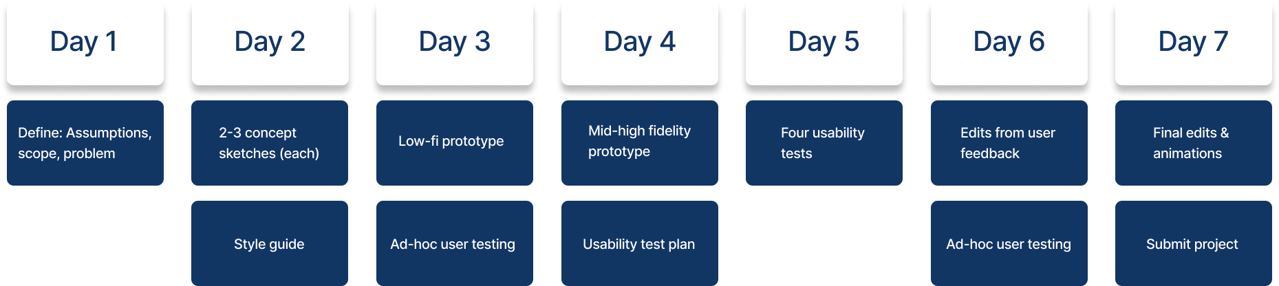 Once we reached a mid-fi prototype, I created a usability test plan to ensure the final days could be dedicated to implementing user feedback and refining the prototype.