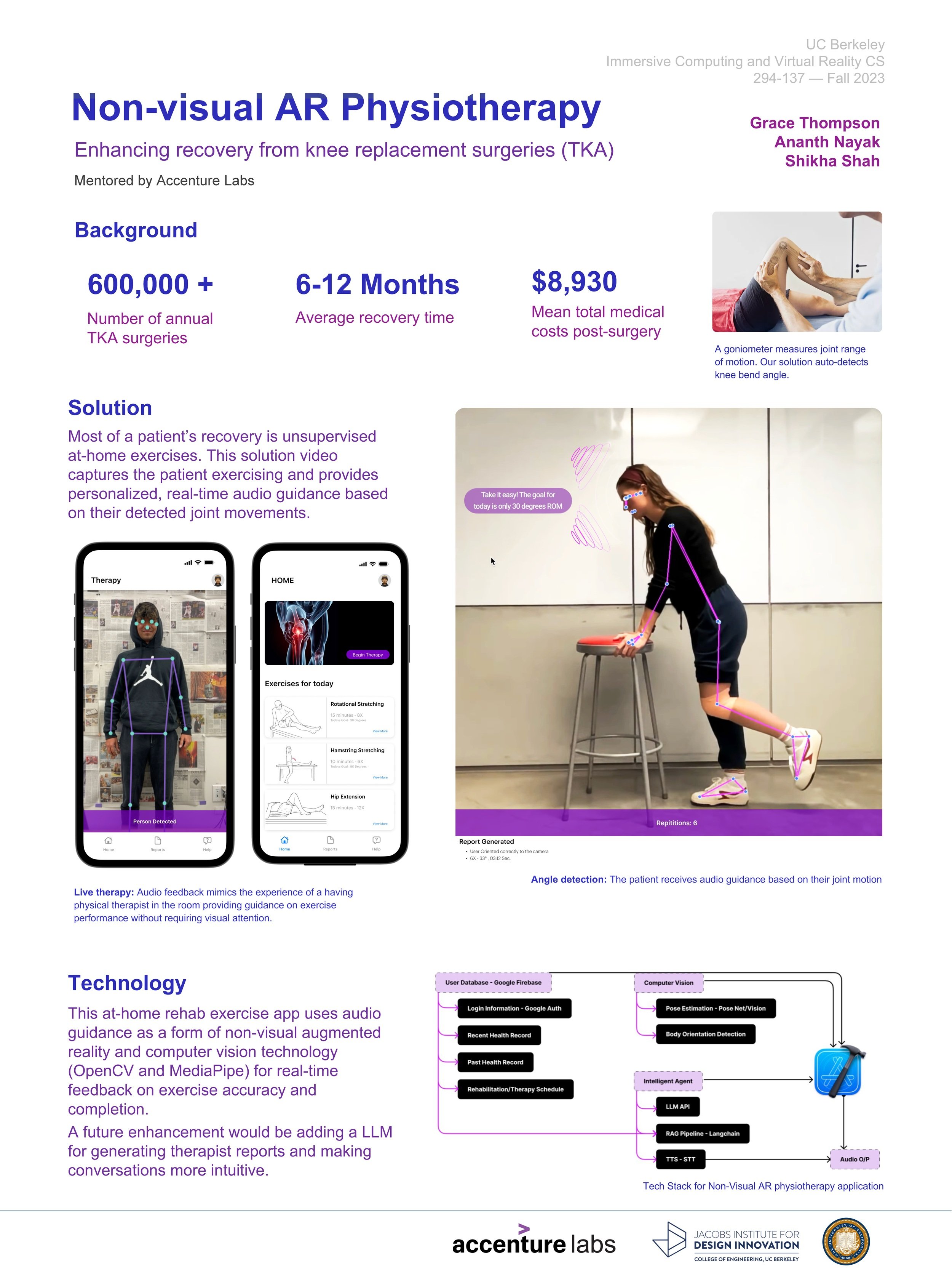 We created an at-home physical therapy app that leverages non-visual Augmented Reality technology to guide people through knee surgery rehab exercises.