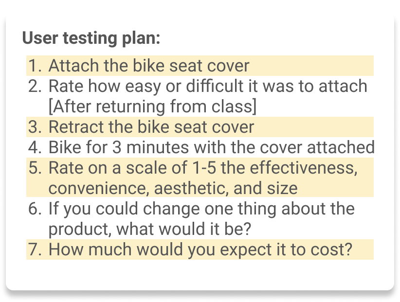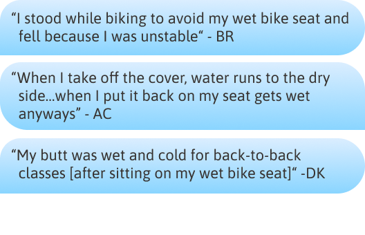 We interviewed a total of 20 student bike commuters, and learned three pain points of a wet bike seat: