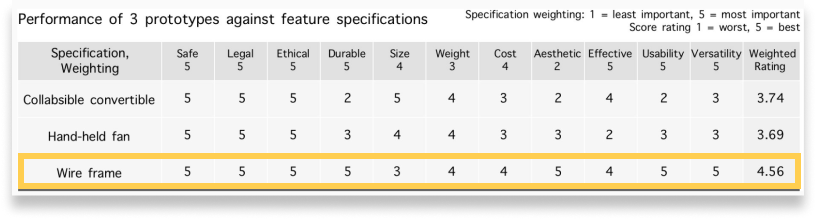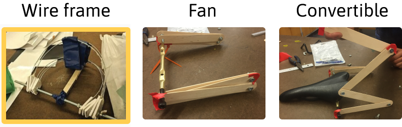 We created 3 prototypes and rank-ordered them based on performance. The wire frame design performed best, being the most durable, effective, and attractive.
