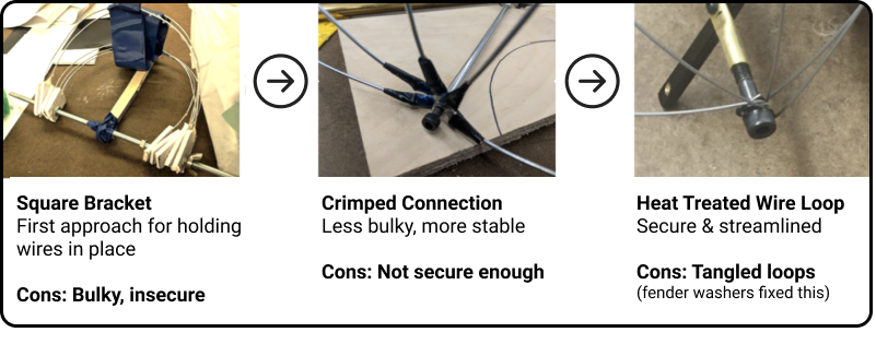 Based on advice from a machine shop advisor, I created heat-treated wire loops. We ended up choosing this option because they were the most secure and streamlined.