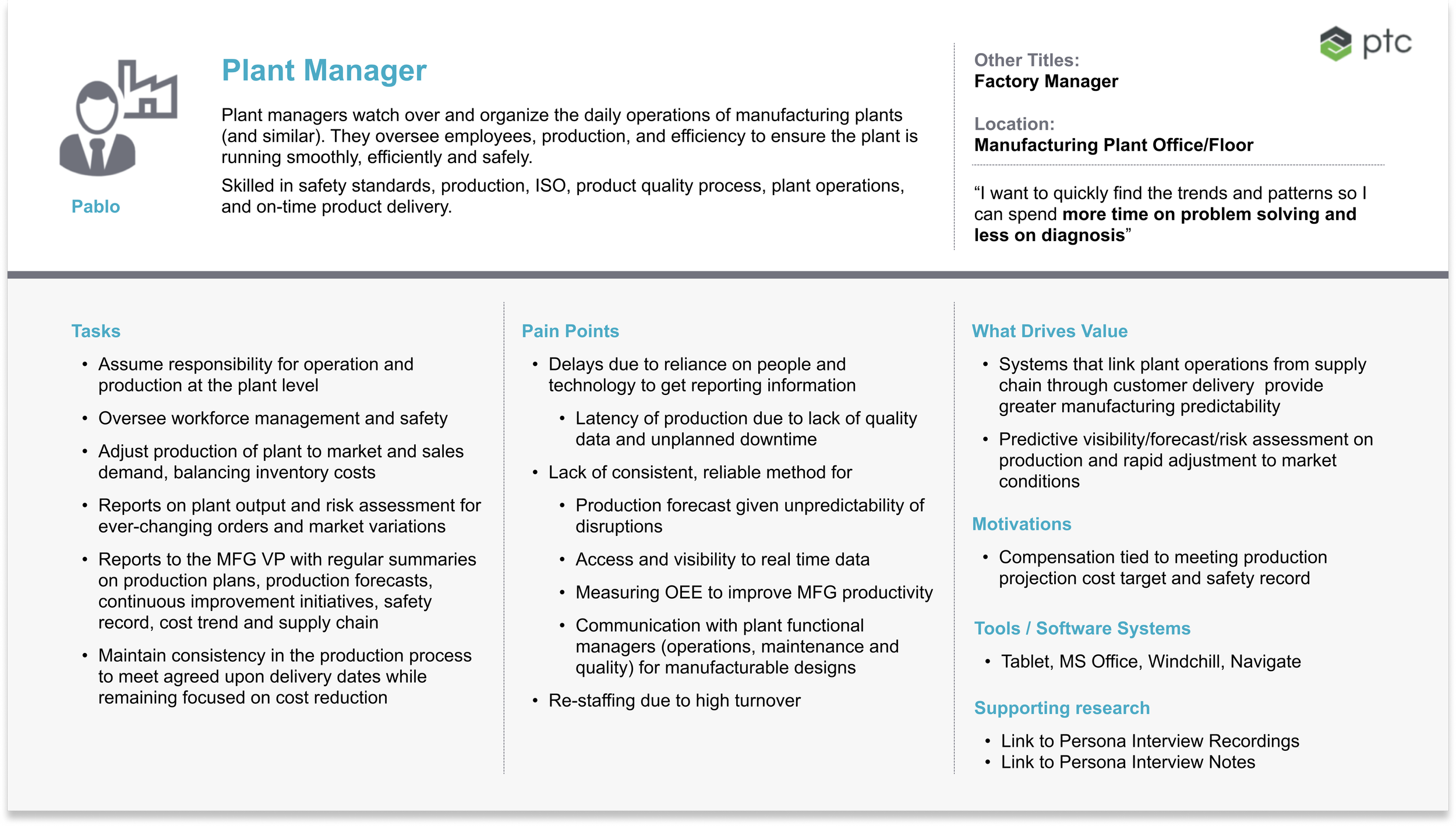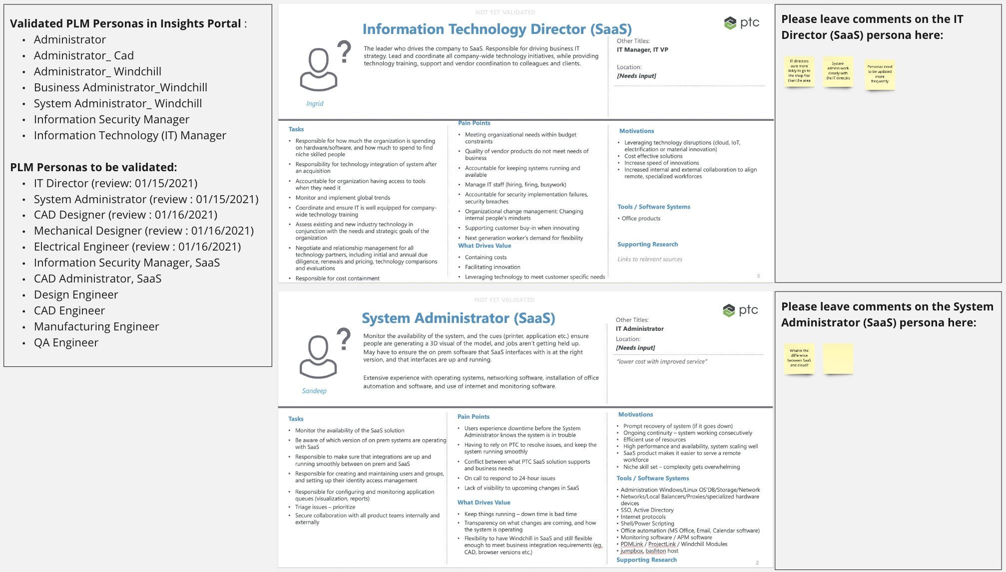 Method: Eight 1:1 interviews with employees from PTC’s Product Teams to learn if/how personas were involved in their design process. This helped determine the content categories included in the new template