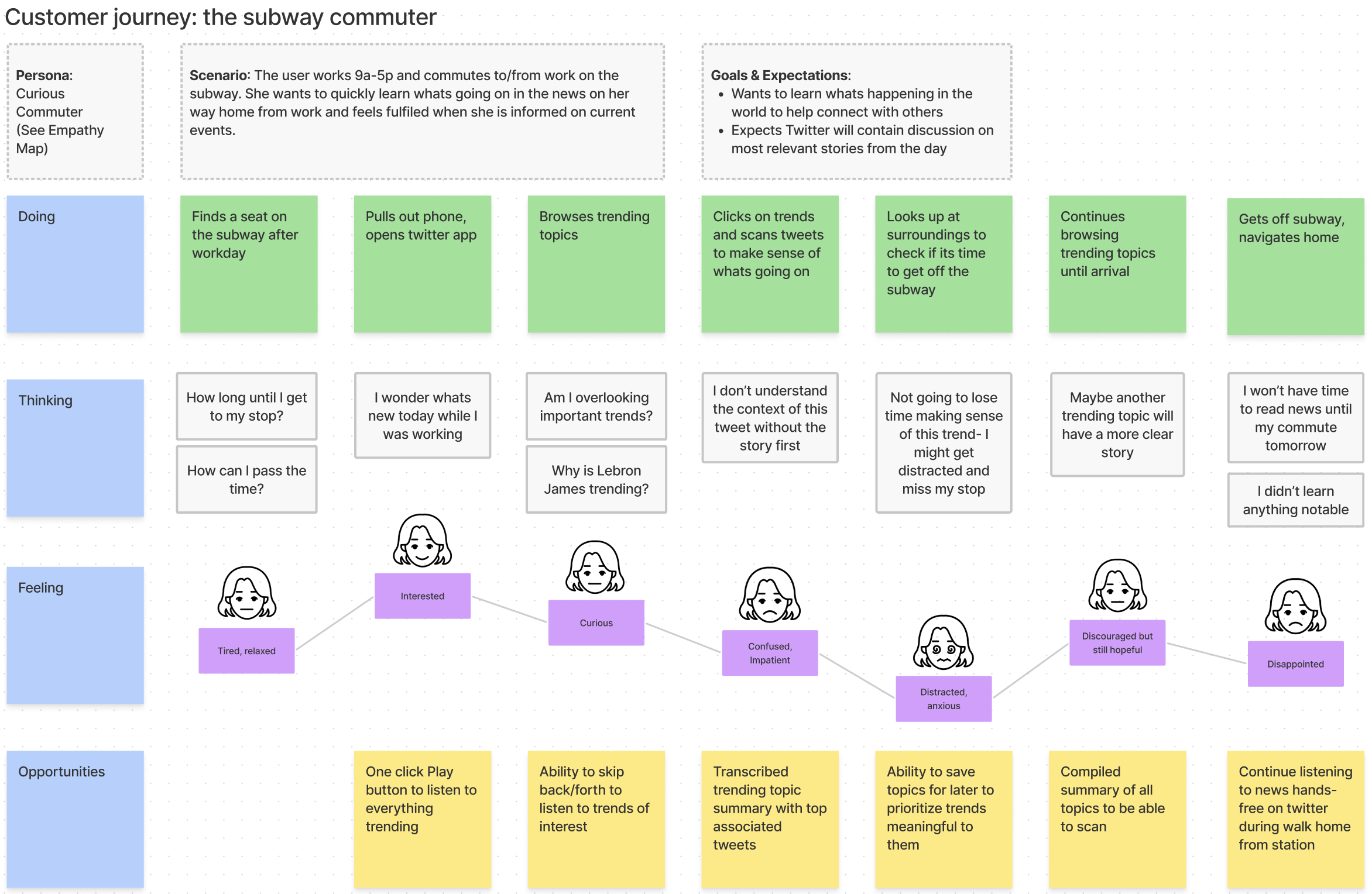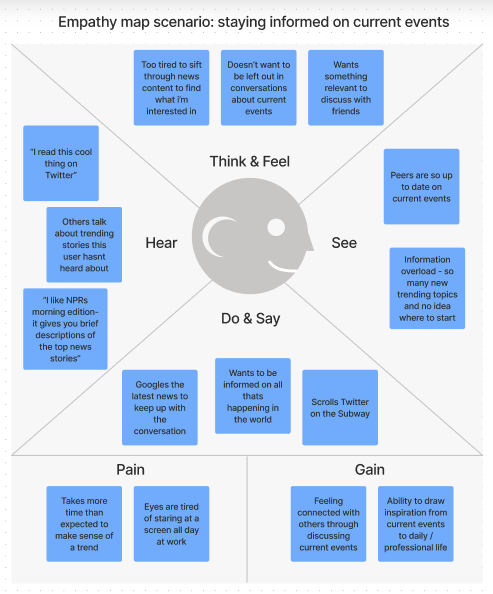 Several participants described listening to news media or reading Twitter on their commute to work. I converted those insights into ‘actions, thoughts, feelings, and opportunities,’ from the perspective of the aforementioned empathy map.