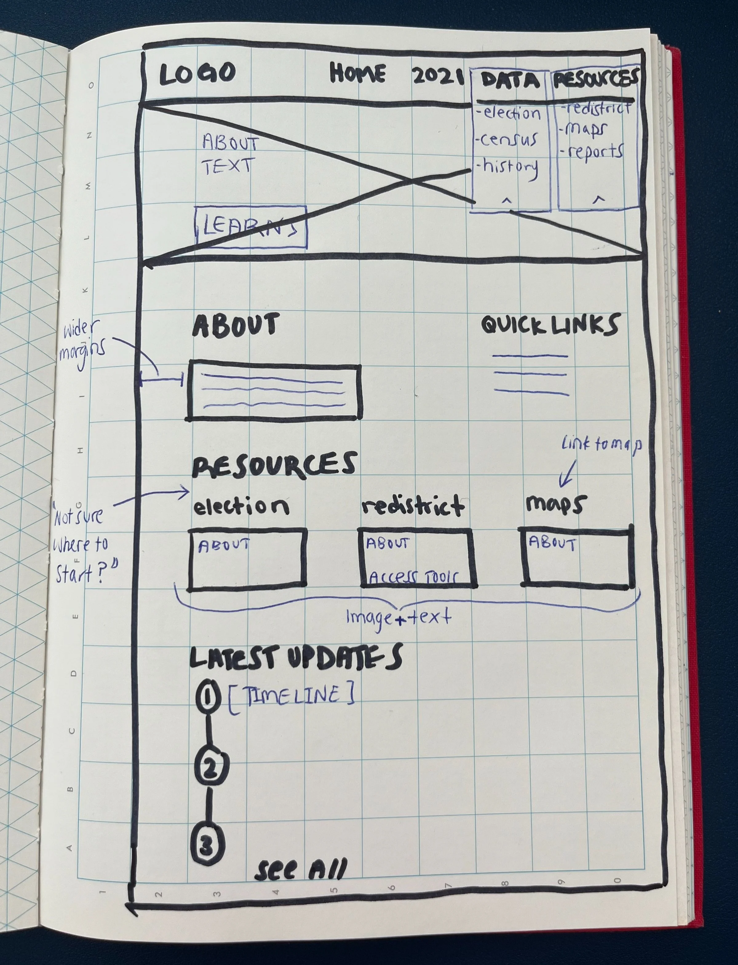 Considering the research takeaways as MVP features, I sketched three homepage wireframes to discuss feasible redesign options as a team. We converged the ideas into one wireframe and translated it into a digital mid-fidelity mockup.