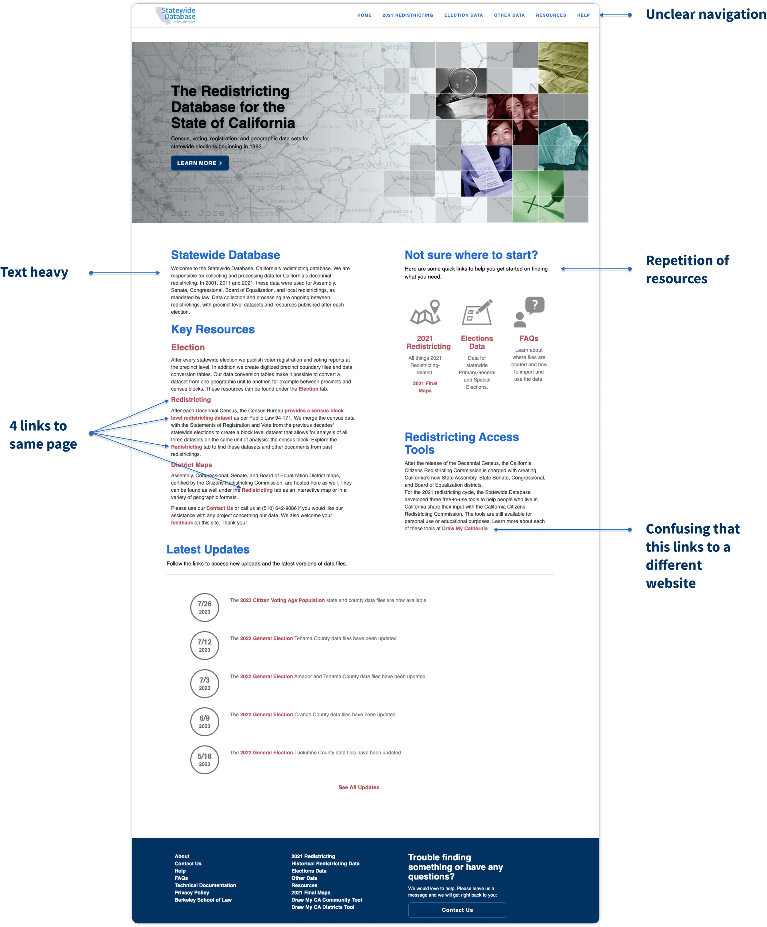 A heuristic analysis of the website helped familiarize with the existing website and identify 3 core opportunities to improve the homepage UX: