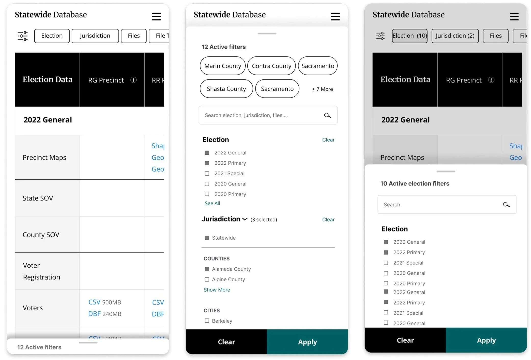 During the second half of the usability test, we A/B tested two filterable table approaches for the Election Data page. The majority of participants preferred the above-table filter version because it aligned with their mental model for filtering data (versus side filter which was associated more with activities such as online shopping).