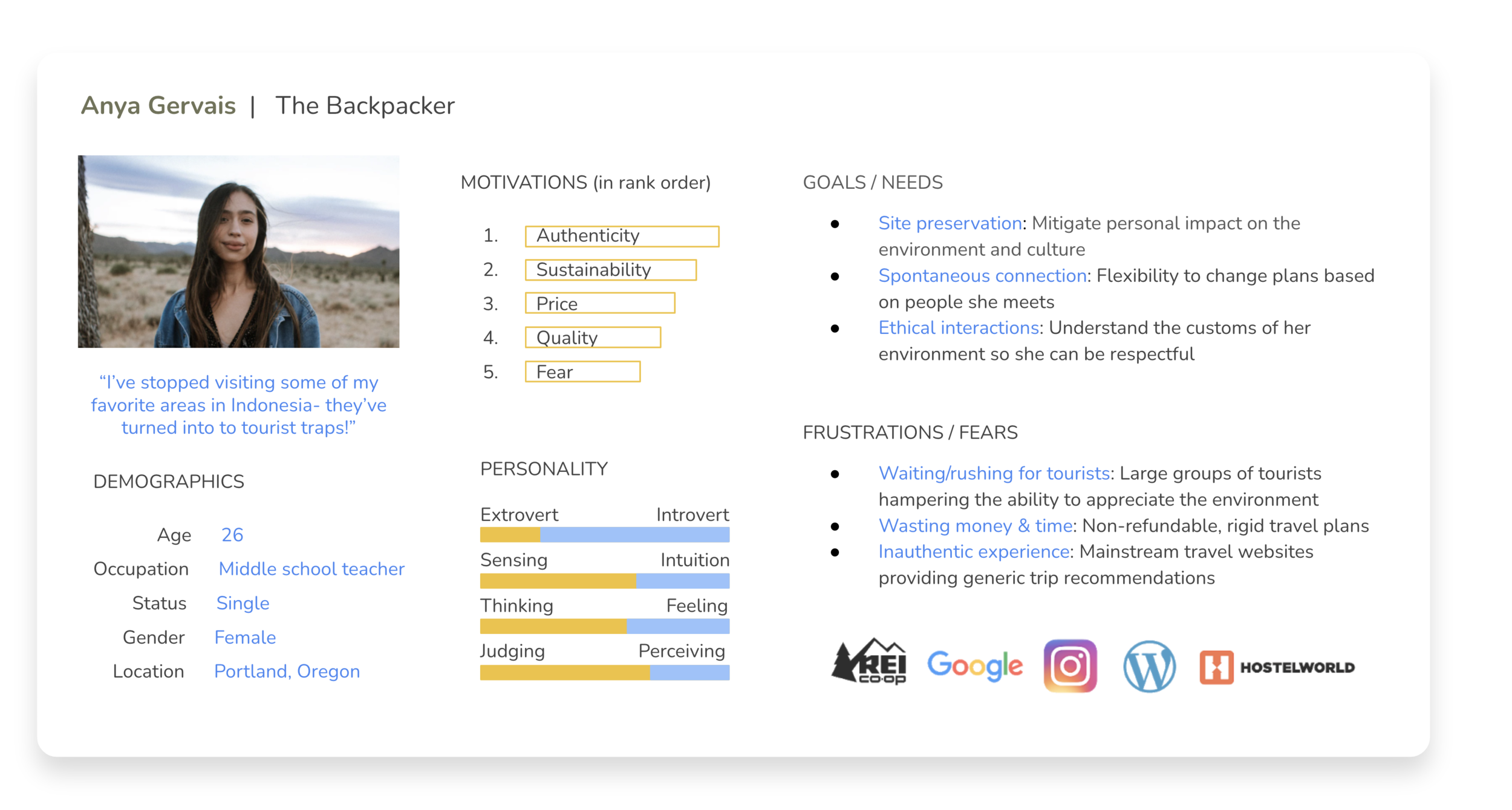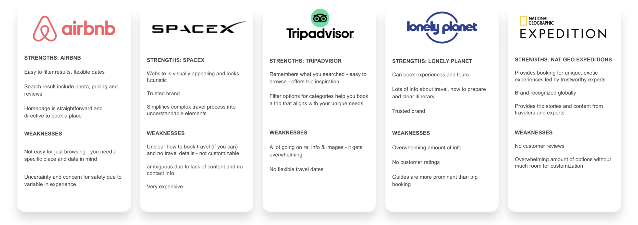 Designing for a technology that doesn’t currently exist means there were no direct competitors, and no customers to gather experience-based insights specific to time travel. With this in mind, I substituted adventure travel as a proxy to understand customer needs regarding time travel.