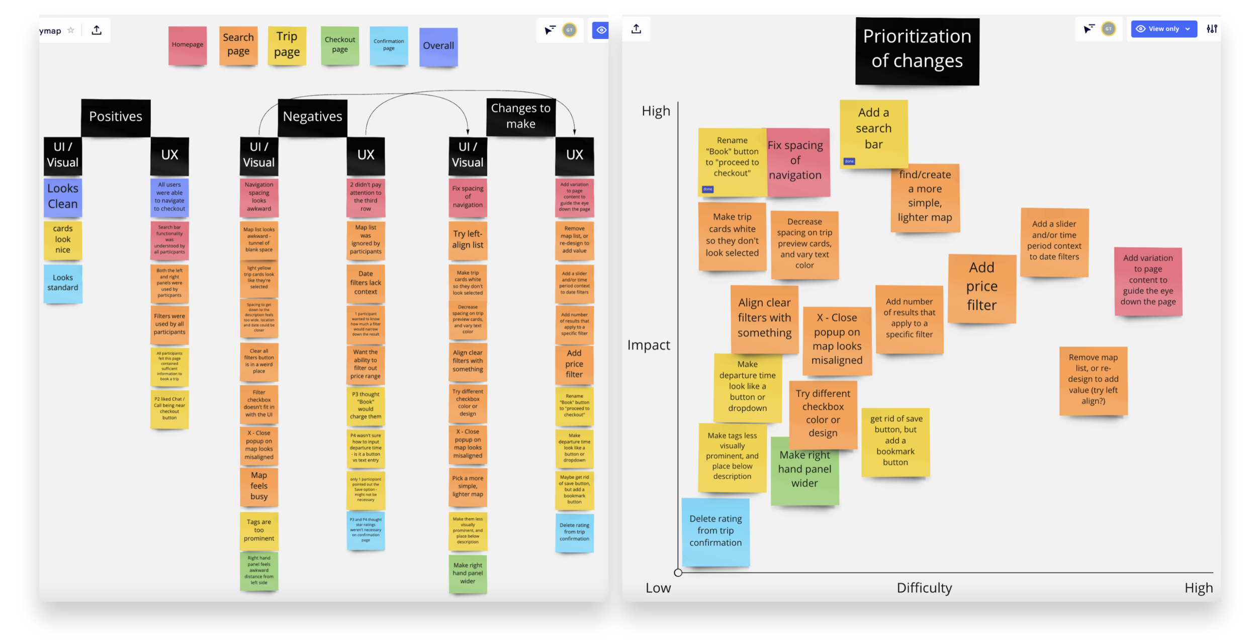 Affinitized usability test notes (left), prioritized updates for final version (right)