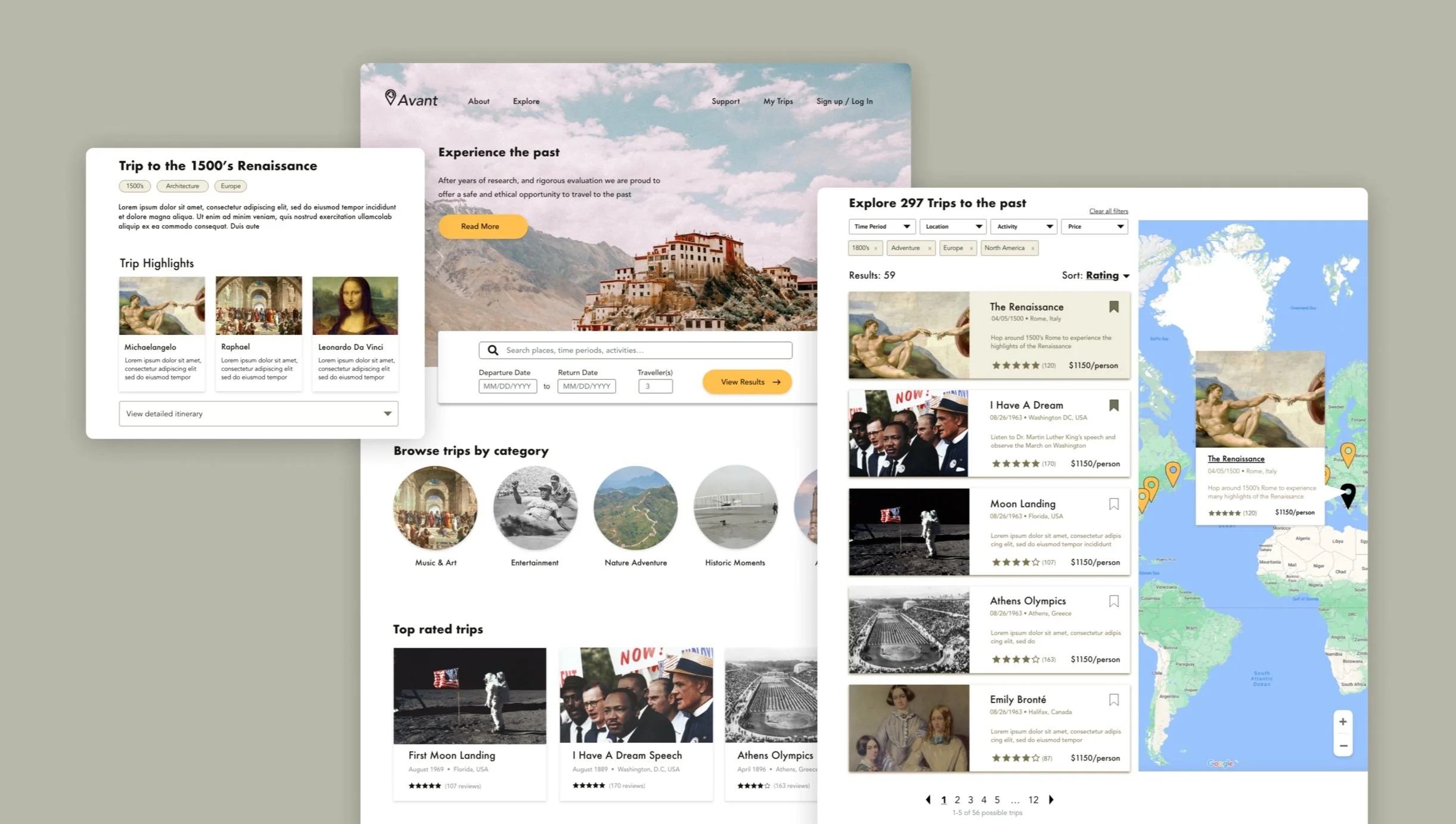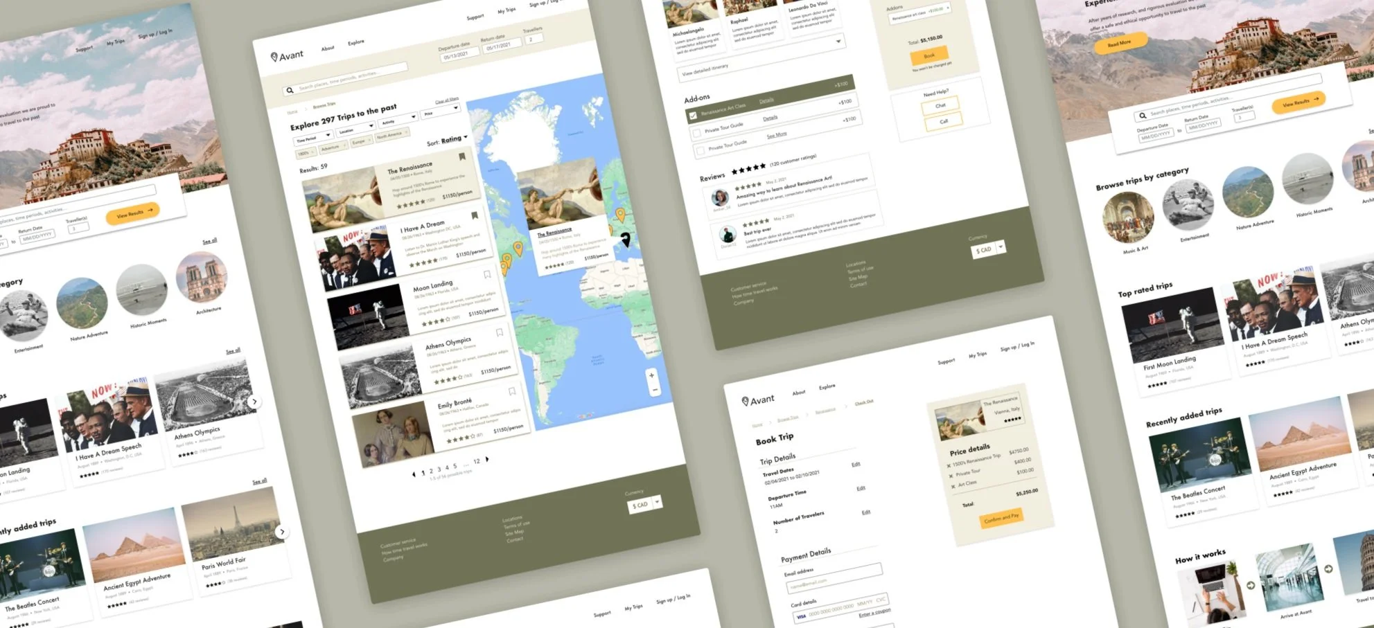This case study responds to a theoretical prompt: Avant launched the first time travel service with 289 destinations set in the past. My objective was to create a modern, yet historic brand identity, and design an e-commerce site that allows customers to browse and book a range of trips.