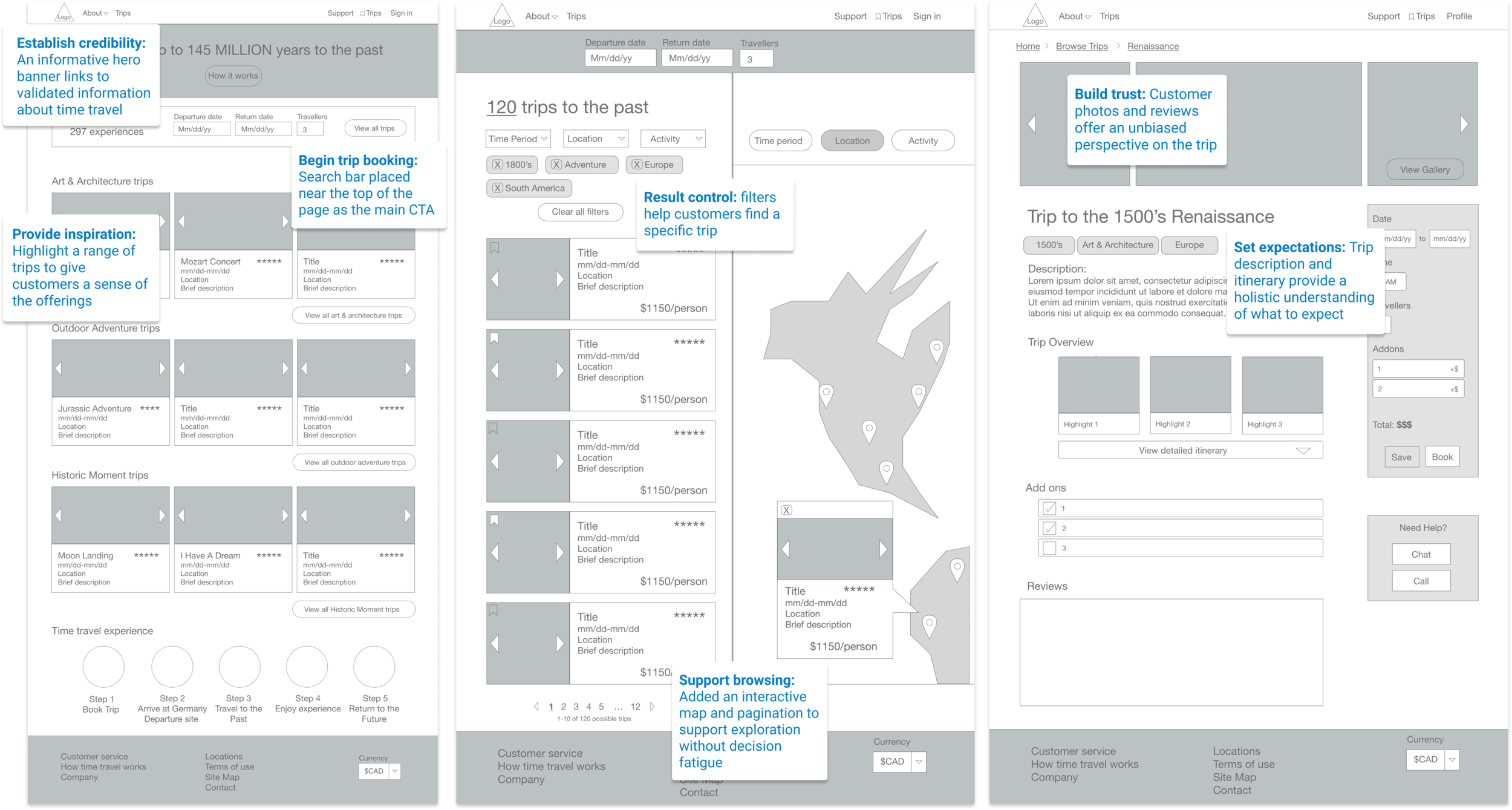 I used XD to iteratively design three screens for booking a trip. For each screen, I defined a purpose to address in the design, as highlighted below: